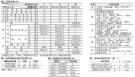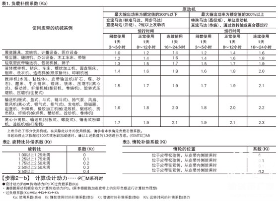 9、其他使用條件 【步驟2-a】 計(jì)算設(shè)計(jì)動(dòng)力……MXL/XL/L/H/S□M/MTS□M系列時(shí) ●設(shè)計(jì)動(dòng)力(Pd)=傳動(dòng)動(dòng)力(Pt) M過負(fù)載系數(shù)(Ks) ·請(qǐng)根據(jù)原動(dòng)機(jī)額定動(dòng)力計(jì)算傳動(dòng)動(dòng)力(Pt)。(原本根據(jù)施加在皮帶上的實(shí)際負(fù)載進(jìn)行計(jì)算較為理想) ·過負(fù)載系數(shù)(Ks)=Ko+Kr+Ki Ko: 負(fù)載補(bǔ)償系數(shù)(表1) Kr: 旋轉(zhuǎn)比補(bǔ)償系數(shù)(表2) Ki: 惰輪補(bǔ)償系數(shù)(表3)
