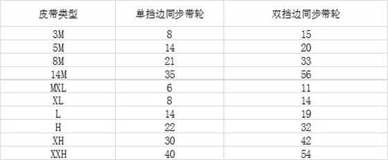 只有一個(gè)同步帶輪有擋邊或者是二個(gè)同步帶輪都有擋邊的情況下,根據(jù)同步帶選型號(hào)選定中心距預(yù)留調(diào)整量。